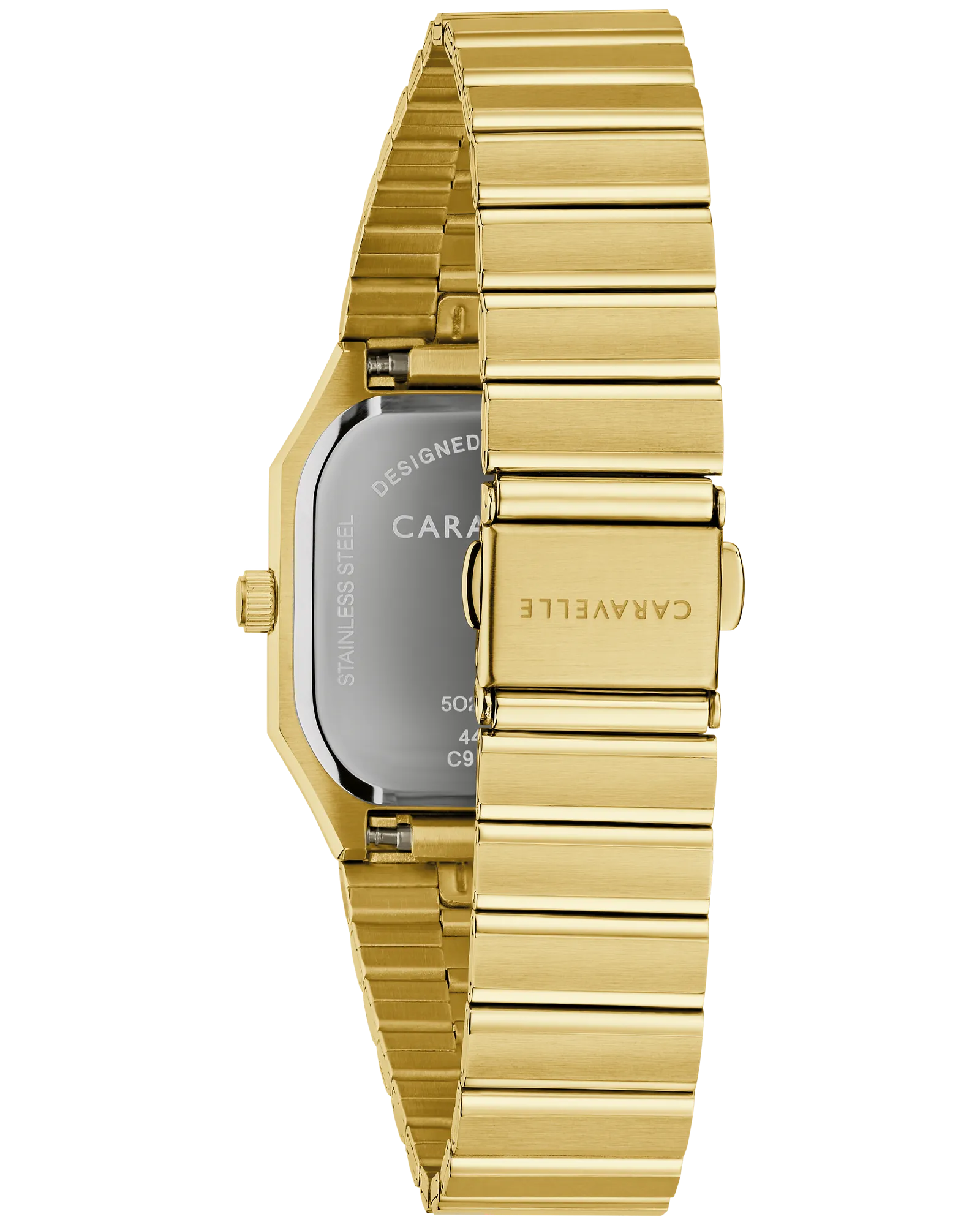 Breaking from traditional design, this bold Caravelle men’s watch captures the essence of vintage aesthetics while delivering modern flair. An integrated dual-finish gold-tone stainless steel bracelet seamlessly connects to the matching rectangular case, the combined silhouette delivering an easy presence on the wrist. The deep black sunray dial is set with applied hour markers, a date, and a polished gold-tone handset. Keep time in style with this Caravelle men’s timepiece.