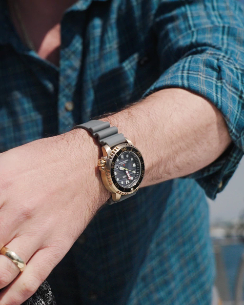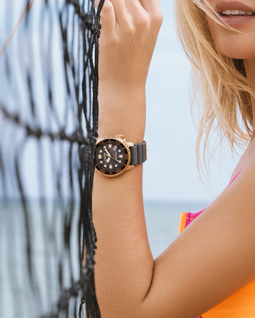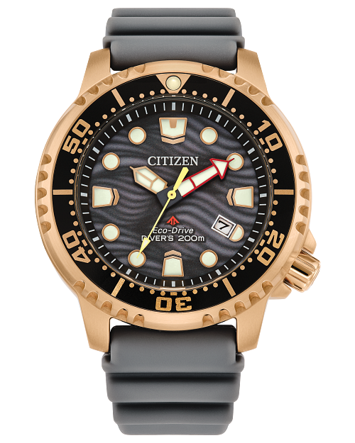 Explore the deepest depths with the latest Promaster Dive in a stylish new colour. This must-have diving watch vibrantly features a rose gold-tone stainless steel case, a grey 3-hand dial with date function, and luminous hands and markers. The durable, grey polyurethane strap with buckle closure completes the look for a comfortable fit. Featuring our sustainable Eco-Drive technology powered by any light that never needs a battery, you’ll wear this high-performance timepiece in high style from adventures on land to the deep blue sea. ISO compliant and water resistant to 200 metres. Calibre E168.