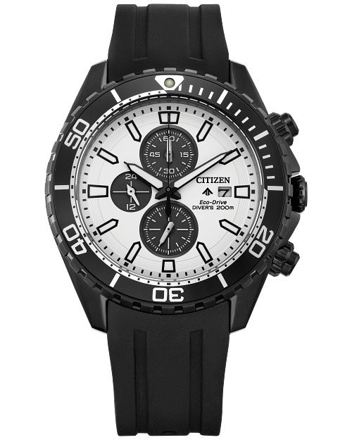 A stylish new update to the Promaster Dive Collection, featuring a stainless steel case and black polyurethane strap with a white dial, a black unidirectional bezel and luminous hands and markers, this must-have dive watch also includes a 1/5 second chronograph measuring up to 60 minutes, 12/24-hour time and date function. Sustainably powered by any light with Eco-Drive technology that never needs a battery, you’ll wear this sporty men’s timepiece in style from office meetings to ocean adventures. Water resistant to 200 metres. Calibre B612.