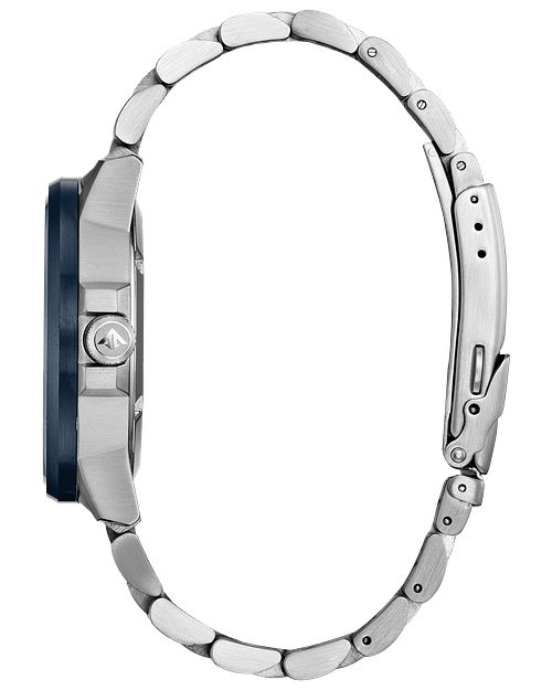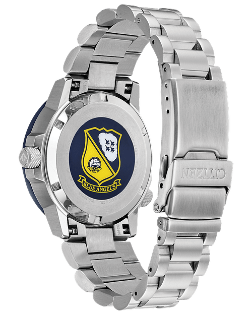 The Blue Angels are the Navy's elite flight demonstration squadron renowned for their precision and grace showcased in each of their flight maneuvers. This precision and grace is exhibited in the CITIZEN Blue Angels Nighthawk seen here with a navy blue ion plated stainless steel case, stainless steel bracelet, and navy blue dial with bright yellow accents. It features 12/14-hour time and a pilots rotating slide ring. Featuring our Eco-Drive technology – powered by light, any light. Never needs a battery.