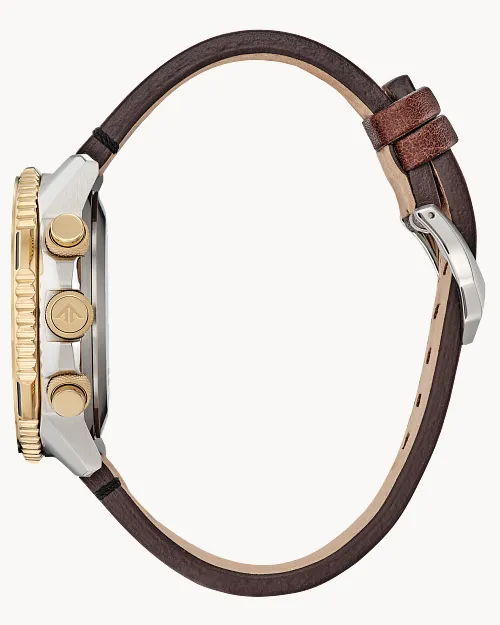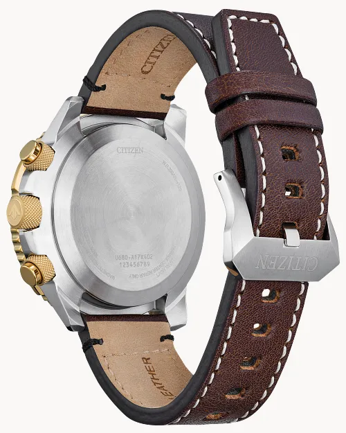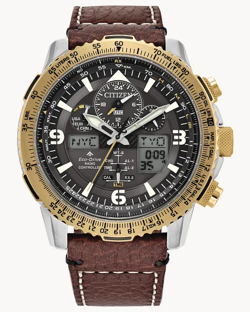 Advanced technology with a deeply iconic look, the latest Promaster Skyhawk A-T reaches a higher altitude in style. Designed with a two-tone stainless steel case and grey dial with luminous hand and encased in sapphire crystal, this exceptional timepiece includes atomic time clock synchronization for superior accuracy, time adjustment available in 43 world cities, 1/100 second chronograph measures up to 24 hours, a perpetual calendar, 2 alarms, 99-minute countdown timer, digital backlight display, Universal Coordinated Time (UTC) display, and a power reserve indicator. The brown leather strap fastens with a buckle closure. This distinctive sports watch utilizes our Eco-Drive technology that’s sustainably powered by light and never needs a battery and is water resistant up to 200 metres. Calibre U680.