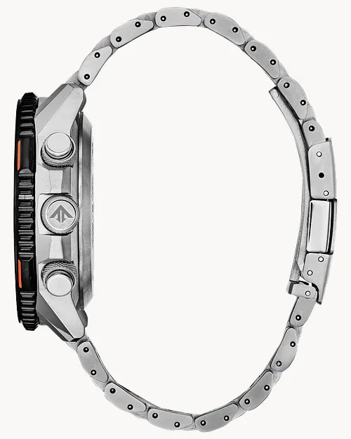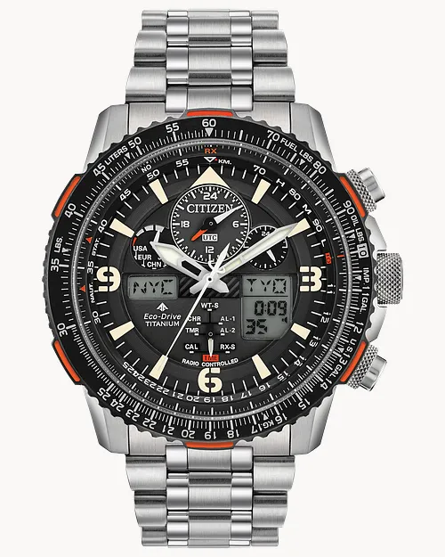 Redefining atomic timekeeping with a turbine inspired bold and powerful timepiece. This edition of the CITIZEN® PROMASTER Skyhawk A-T collection is remarkably dynamic and visually appealing. With atomic timekeeping in 43 cities, this 1/100-second chronograph watch features a perpetual calendar, dual time, 2 alarms, a countdown timer, digital backlight and UTC displays, a power reserve indicator, and a pilot's rotating slide rule bezel. This model is shown in Super Titanium™ with a diamond-like carbon (DLC) coated bezel, a black dial with bright orange details, and unique case and dial motifs. Featuring our Eco-Drive technology – powered by light, any light. Never needs a battery.