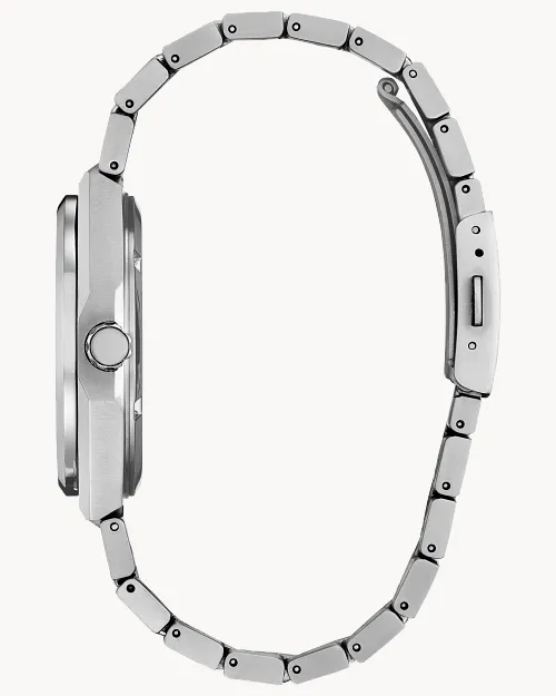 Pairing classic proportions and innovative technology with a distinctly modern style, we present our new Integrated Super Titanium™ Automatic series. Made with our proprietary material, Super Titanium™, which is five times harder and 40% lighter than stainless steel and is scratch- and rust-resistant, this sporty timepiece features a 40.5mm silver-tone Super Titanium™ case that is elevated with finely brushed and polished finishing while being secured to the wrist with an integrated matching bracelet. On the dial, a textured blue colour is accented with an outer minute ring in black, with silver-tone details and luminous hands and markers. A date window at the 3 o'clock position adds daily utility, while an off-centre sub-dial beside it indicates the running time powered by the mechanical movement inside. Water resistant to 100 metres. Automatic calibre 8213.