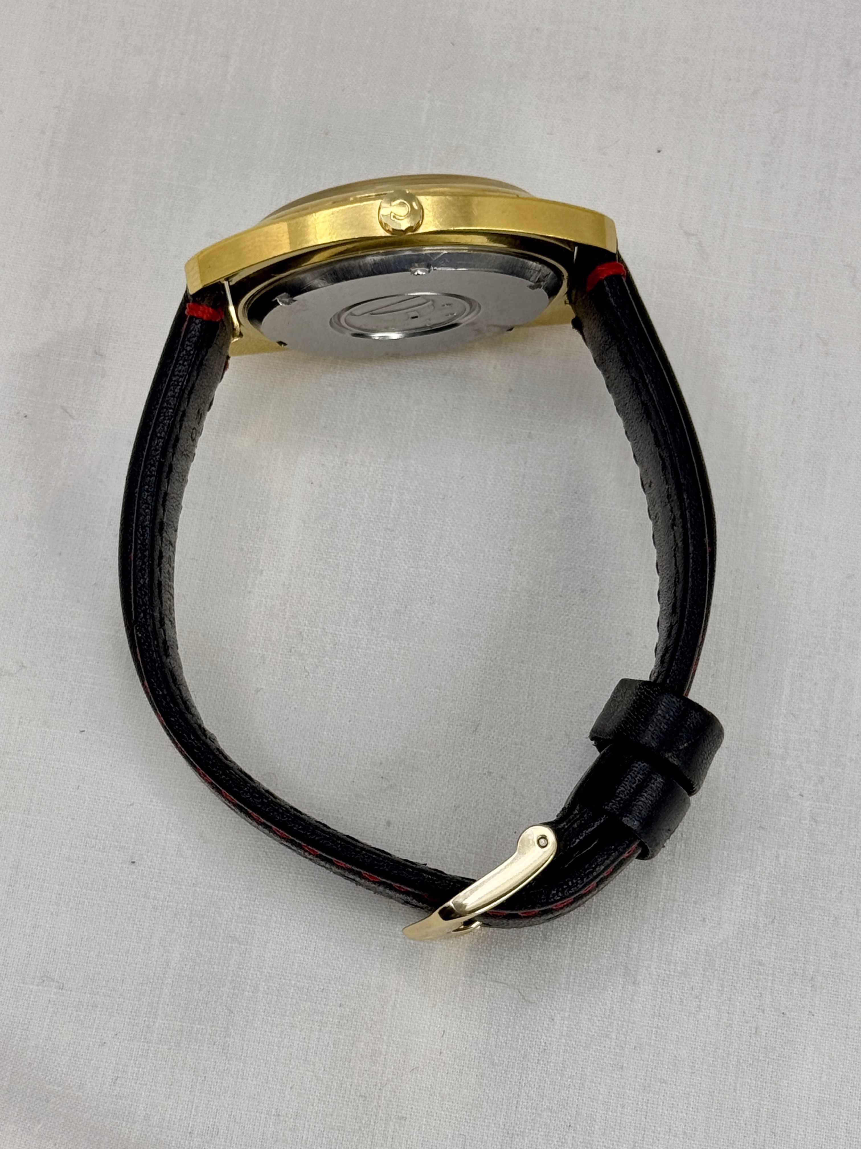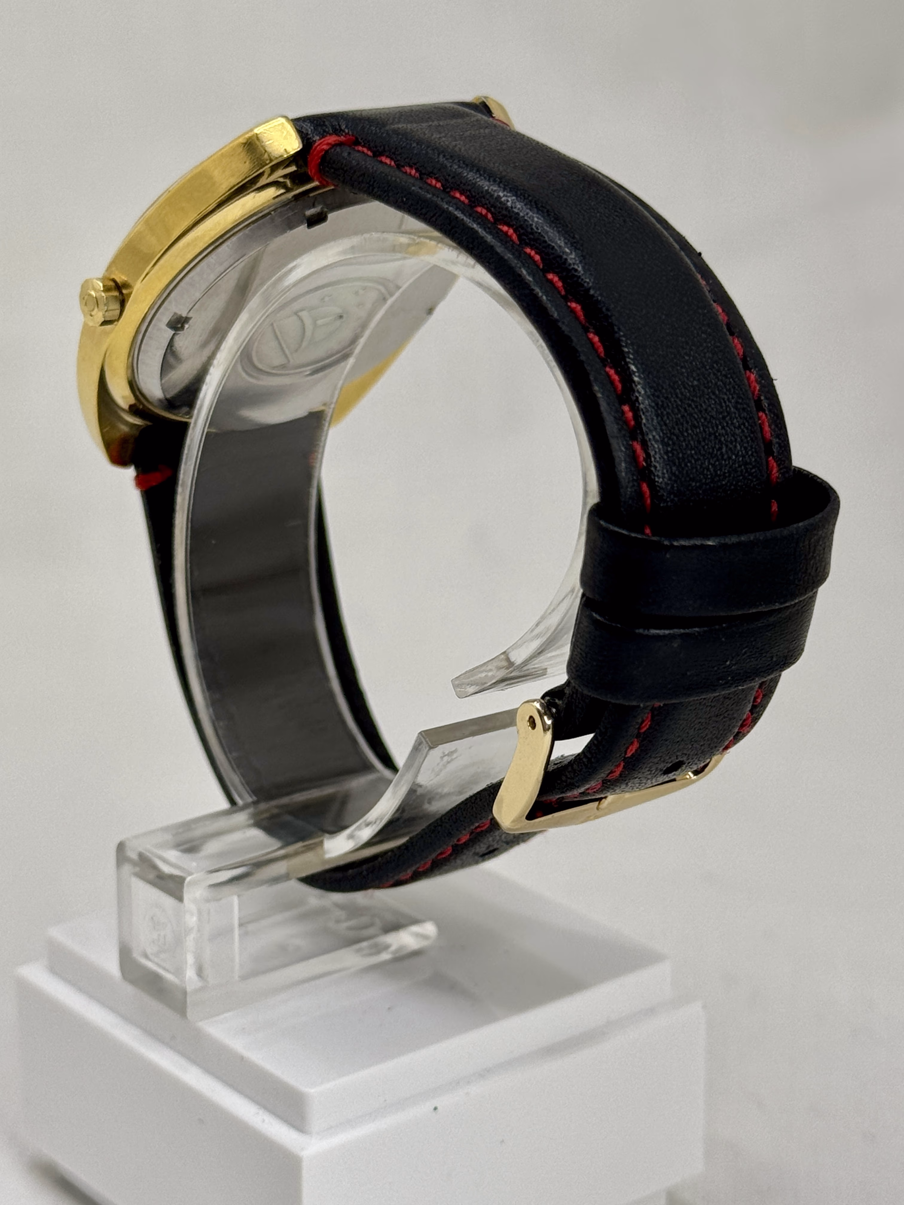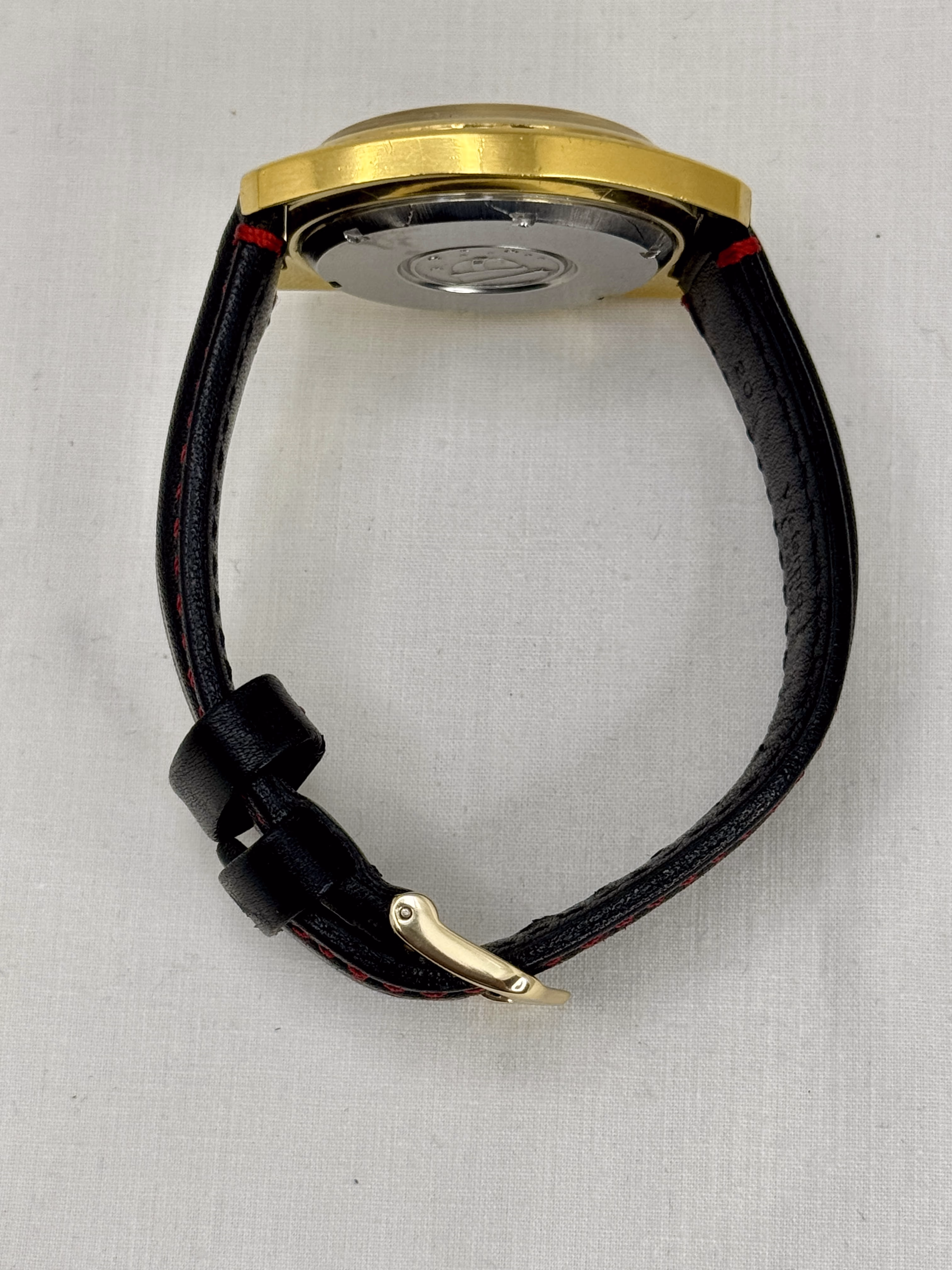 Aftermarket black leather strap with red contrast stitching and gold-tone buckle.