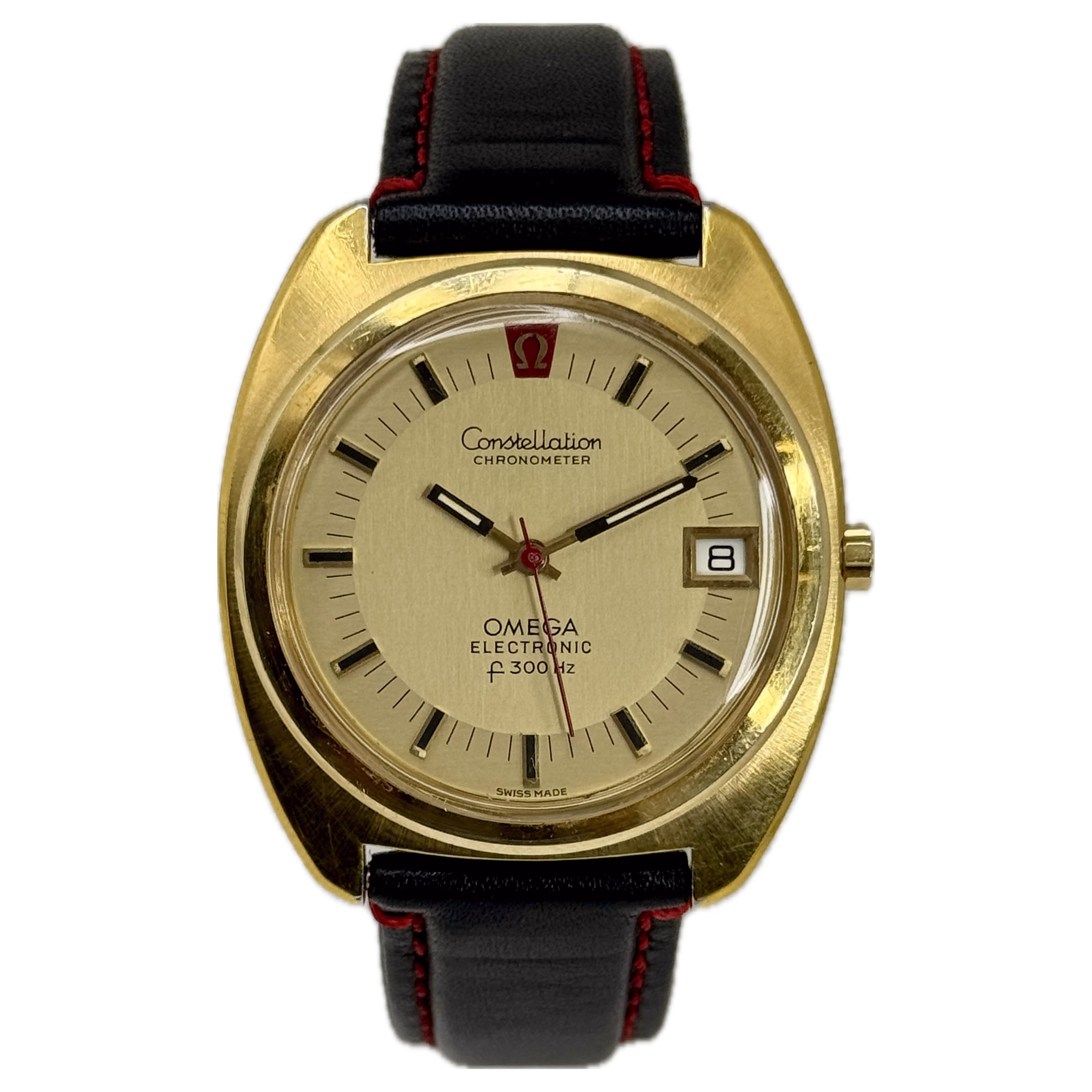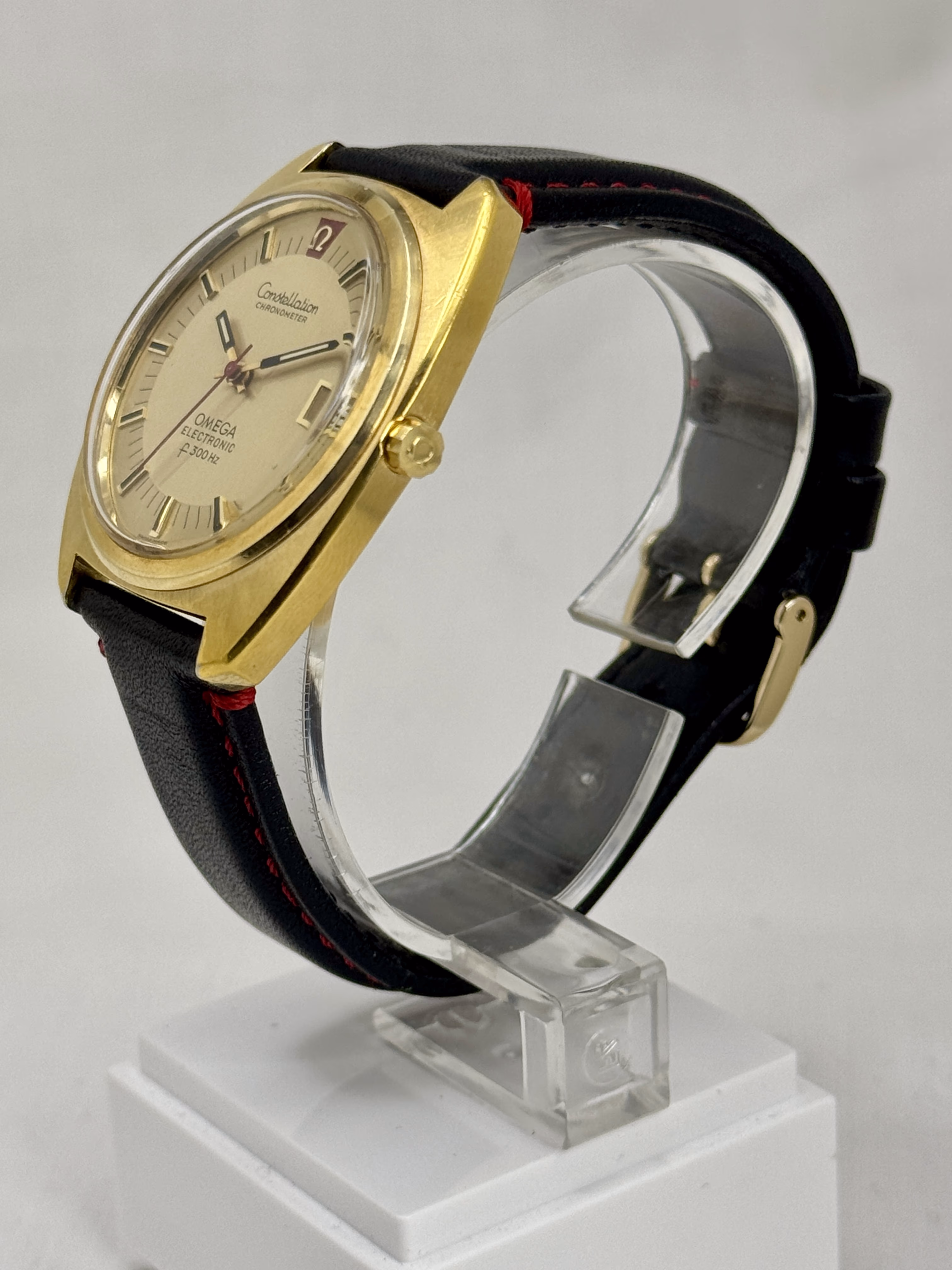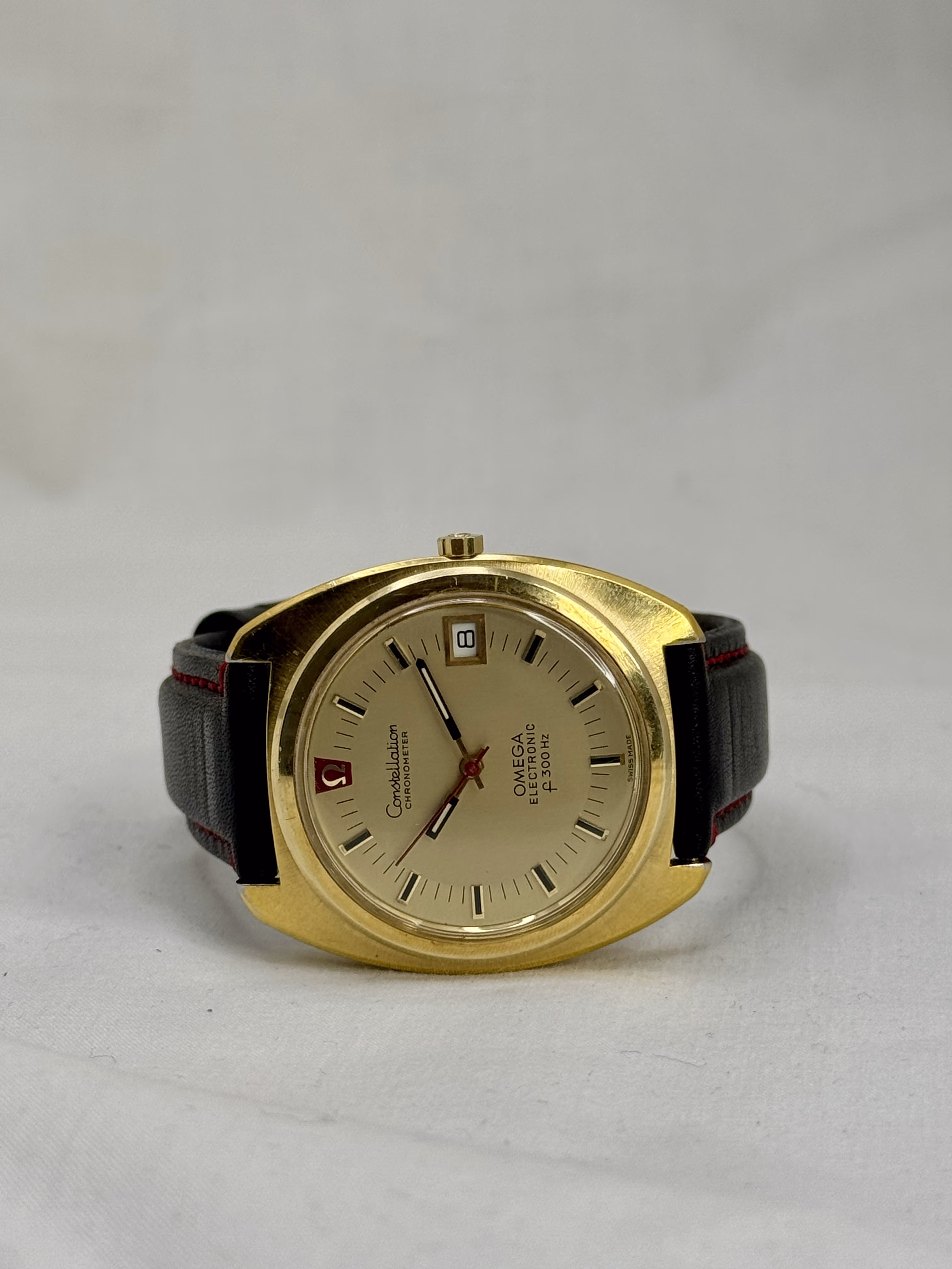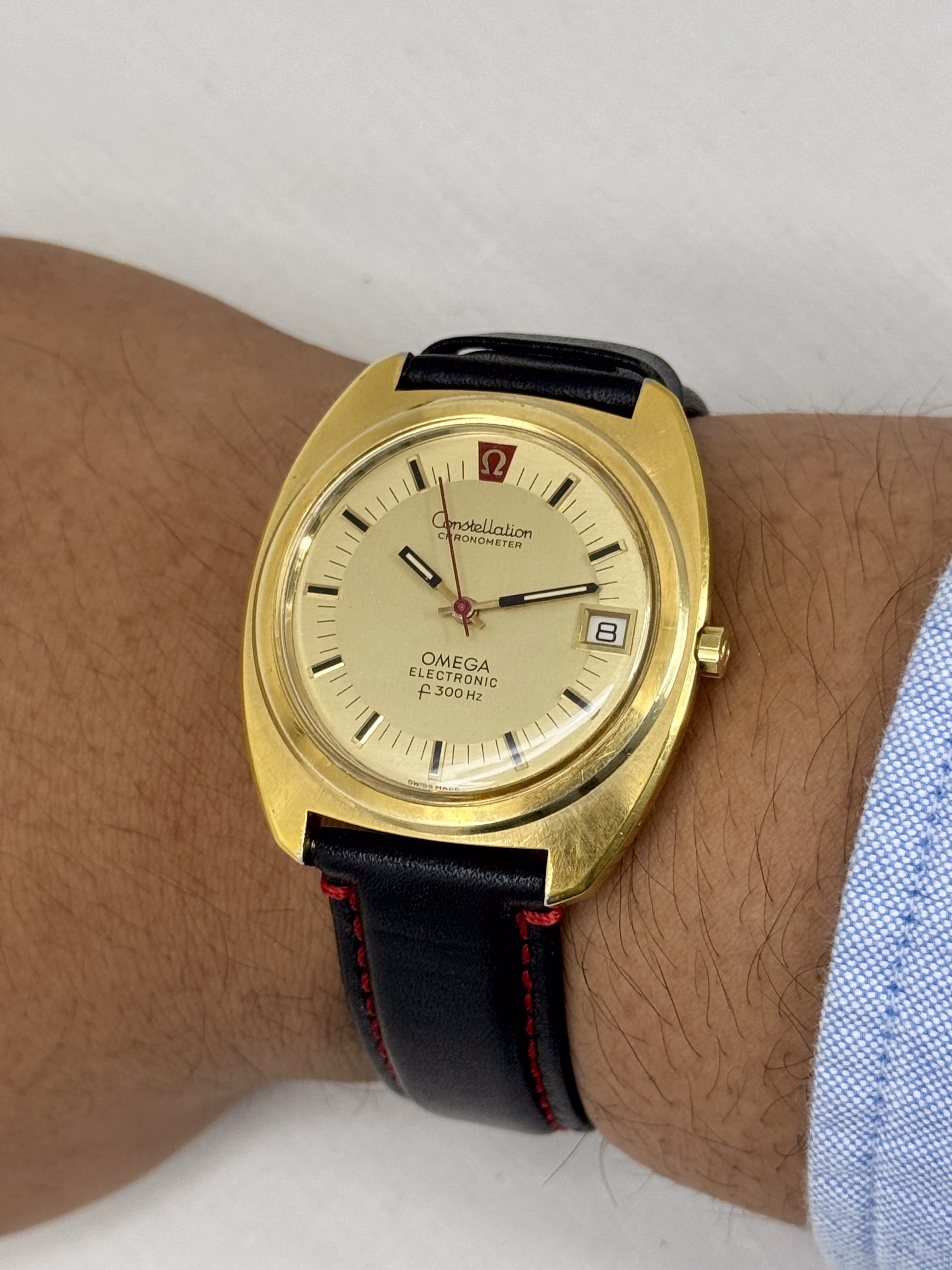 Aftermarket black leather strap with red contrast stitching and gold-tone buckle.